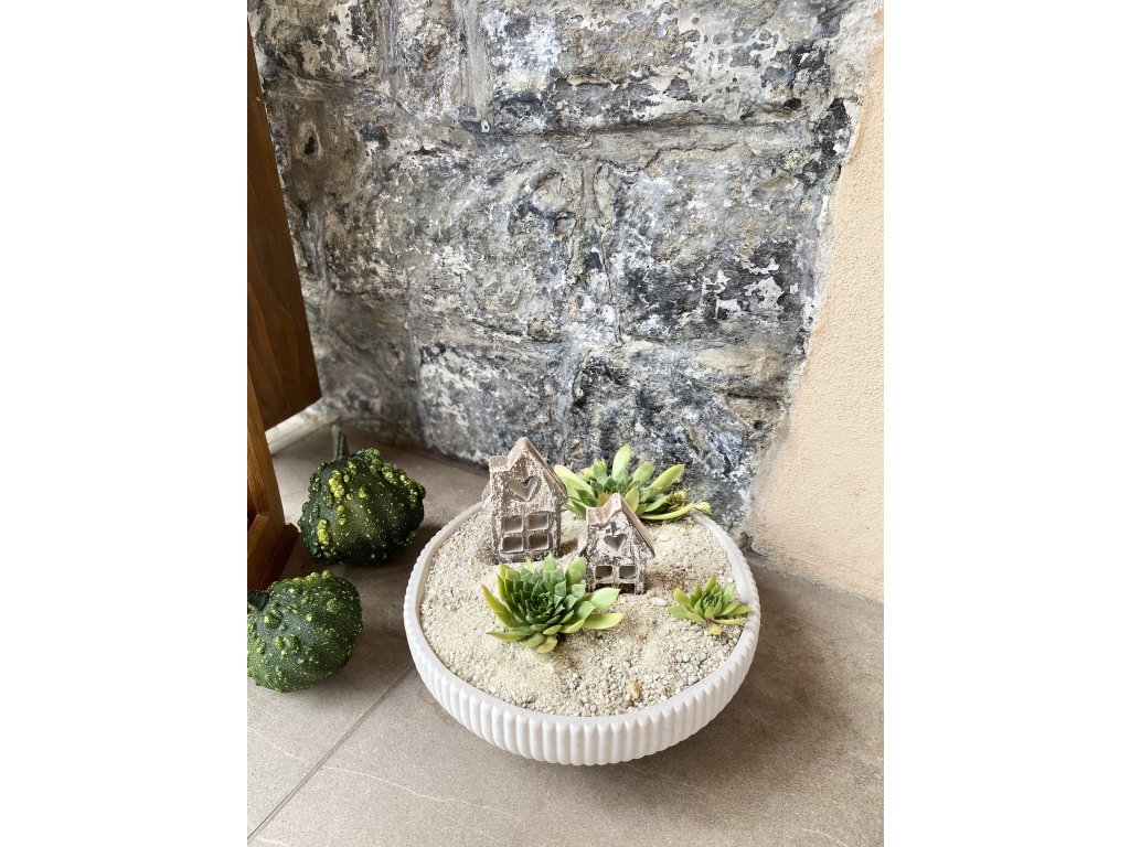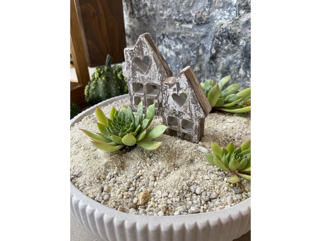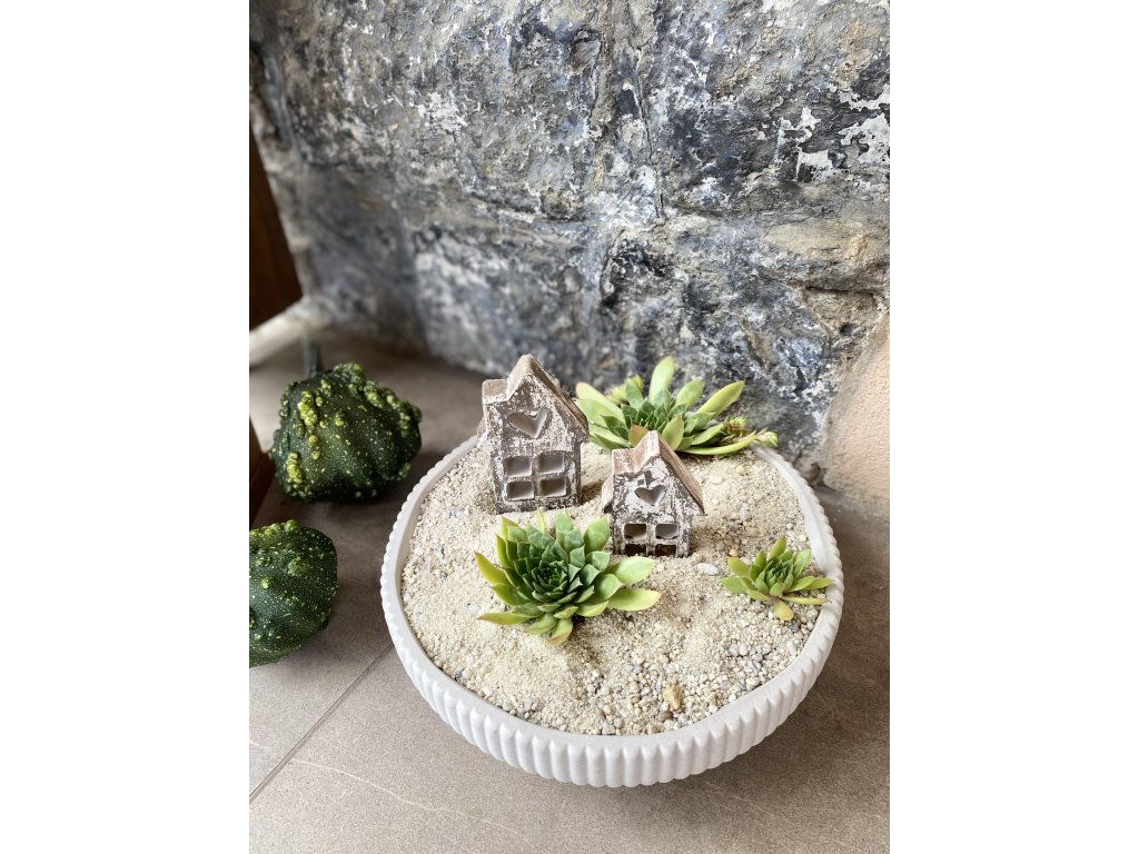 Vlastnoručně vyrobená betonová miska ukrývá malý pohádkový svět – dva ručně odlévané a malované domečky z betonu, zasazené mezi nenáročné netřesky. Tyto drobné sukulenty jsou symbolem odolnosti a síly, přežijí téměř cokoliv a nevyžadují žádnou zvláštní péči.