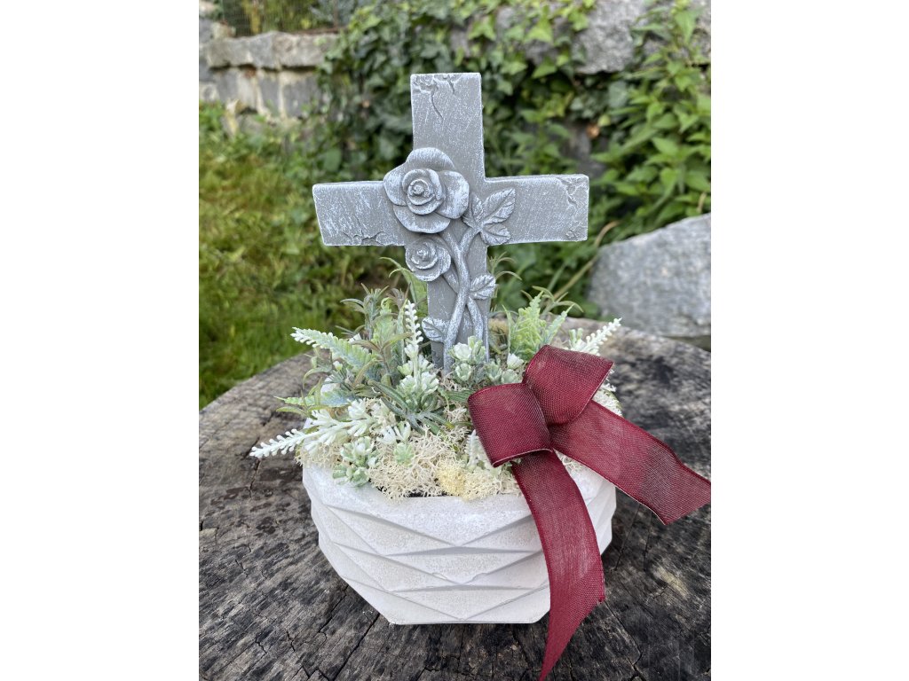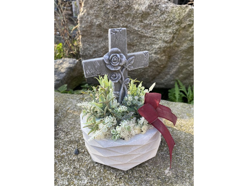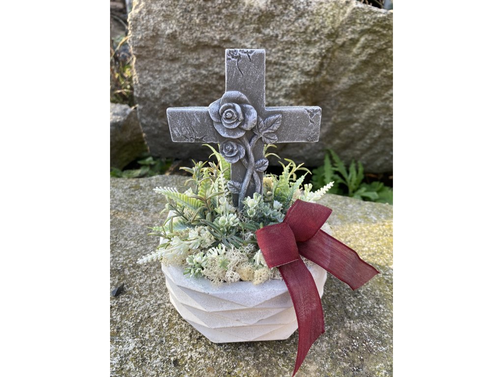 Dušičkové aranžmá s křížem a růžemi v betonové misce