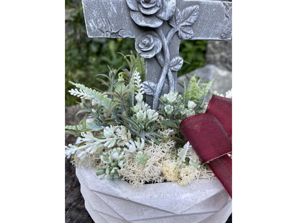- Materiál: beton, umělé květiny, stabilizovaný mech, látková mašle