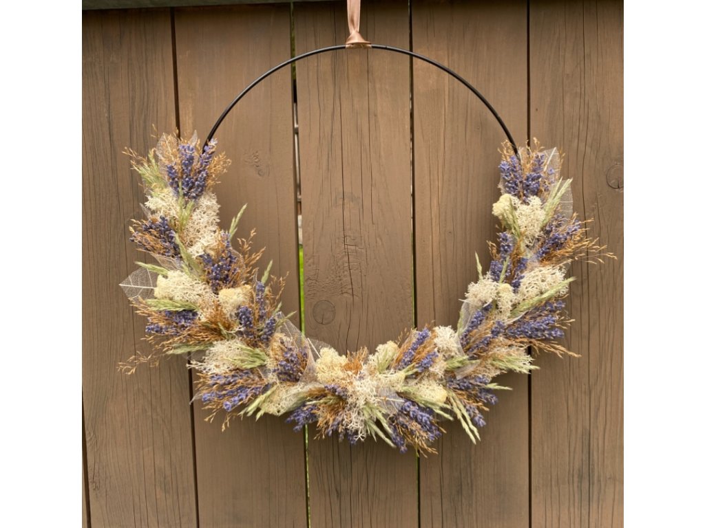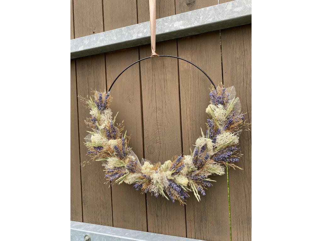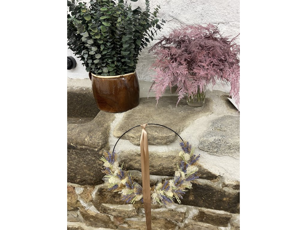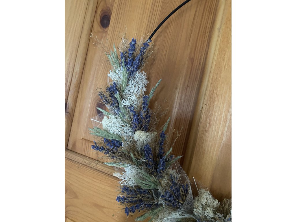 - Materiál: kruhová obruč, traviny, levandule, stabilizovaný mech, stuha