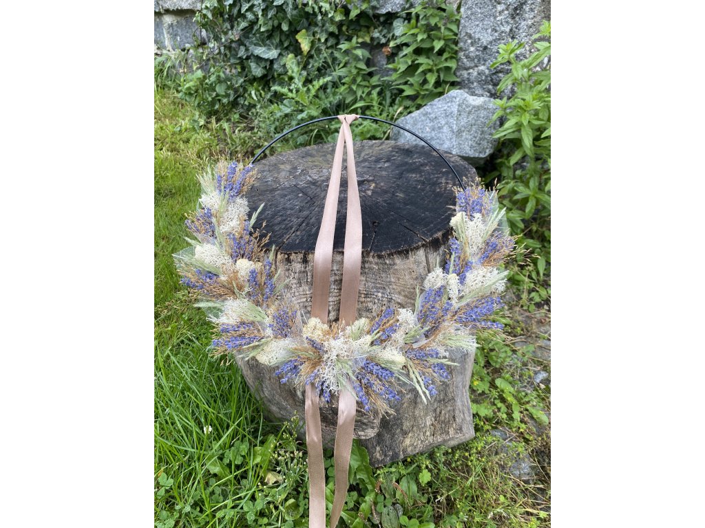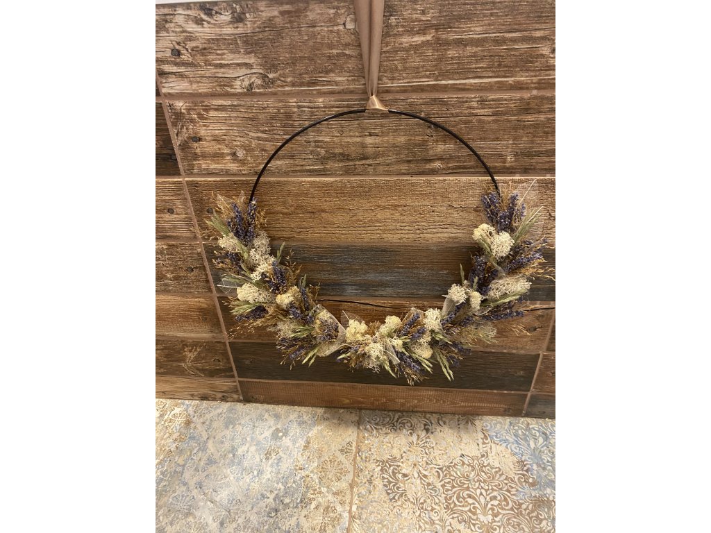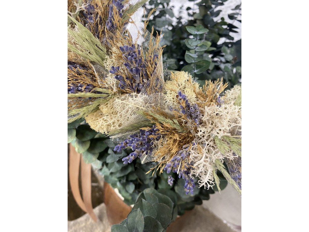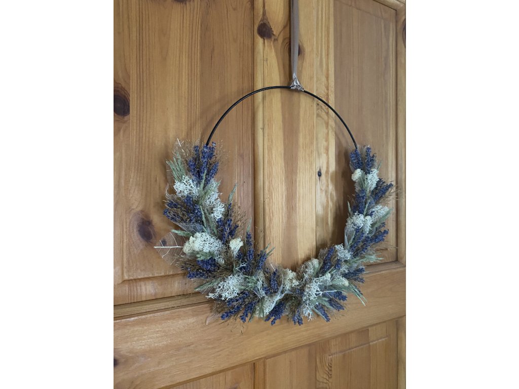 - Materiál: kruhová obruč, traviny, levandule, stabilizovaný mech, stuha