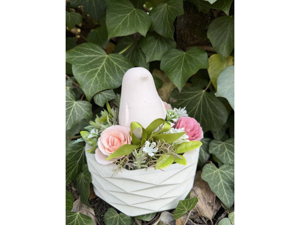 Materiál: Ručně odlévaná betonová miska, kvalitní umělé květiny, dekorační figurka ptáčka