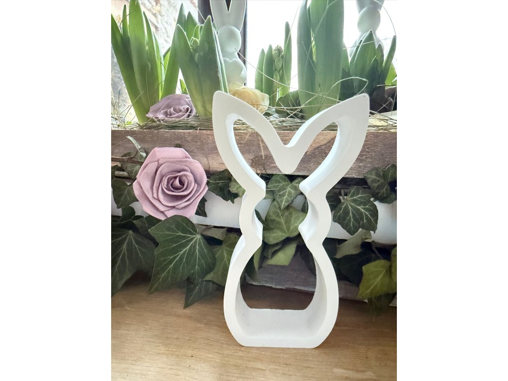 Zajíček je určený k volnému postavení – krásně vynikne na stole, parapetu nebo v jarním aranžmá.